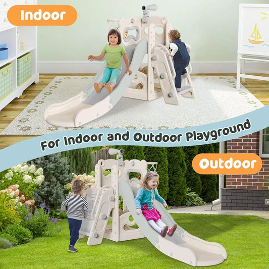 6 in 1 Kids Indoor Slide for Toddlers 1-3, Baby Slide Outdoor with Basketball Hoop and Telescope, L Sh